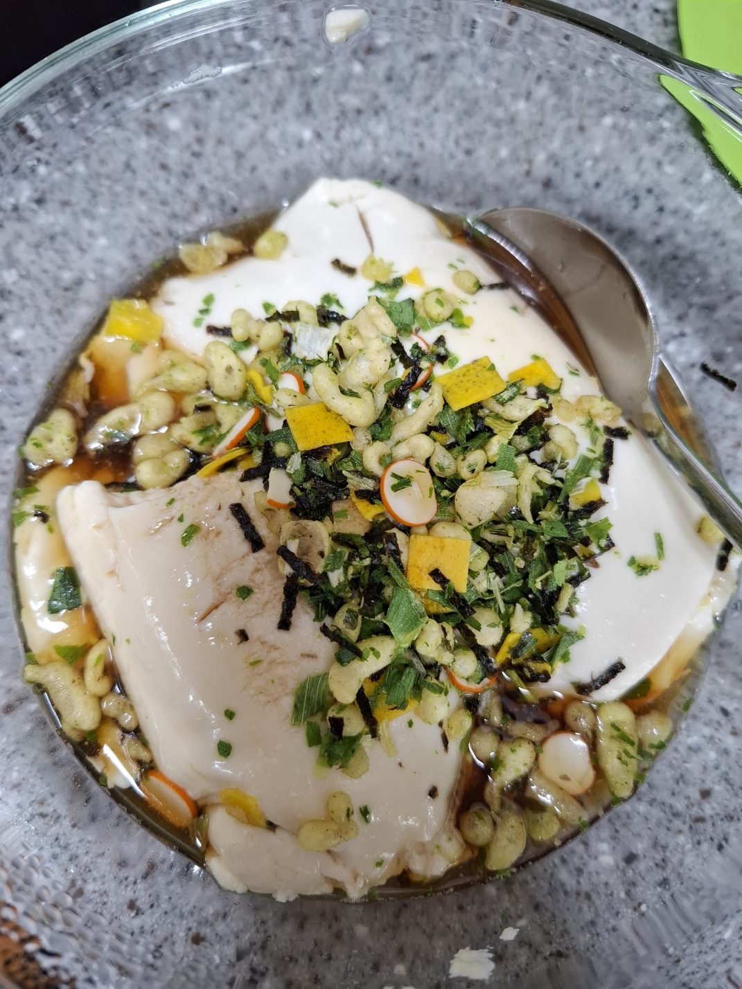물기를 제거한 순두부에 우동건더기 스프를 취향껏 뿌려줍니다.