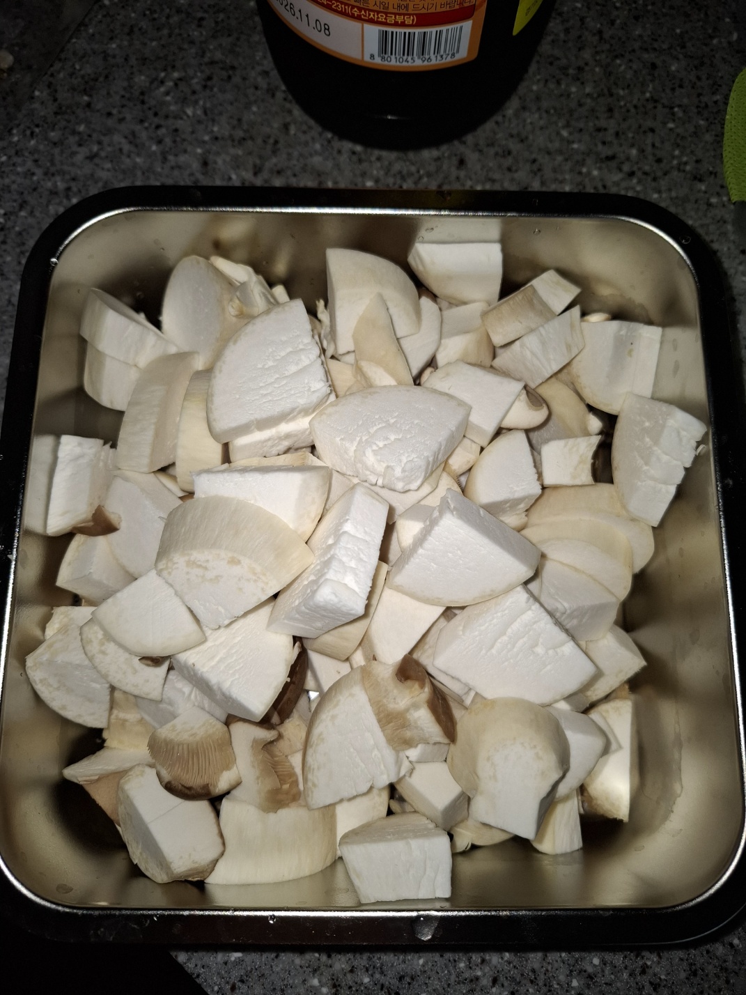 새송이버섯을 흐르는 물에 깨끗이 씻은 뒤, 한 입 크기로 썰어줍니다.