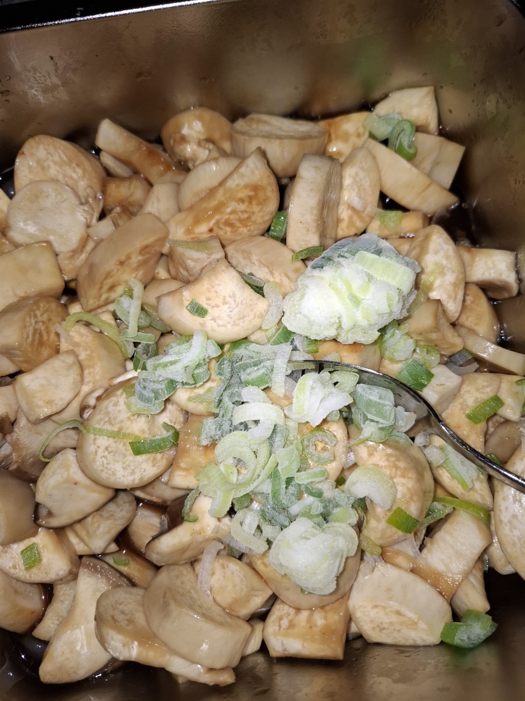 5분 후 꺼내보면 버섯에서 나온 물이 많습니다. 간을 보고 부족하면 양념을 50ml 더 넣고 썰어둔 파도 함께 넣어주세요. 이번엔 뚜껑을 열고 10분 더 돌려줍니다.